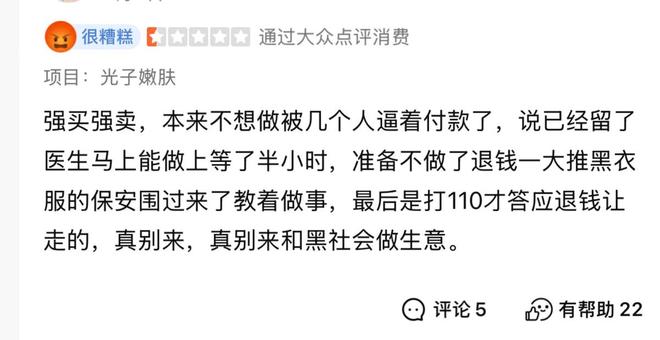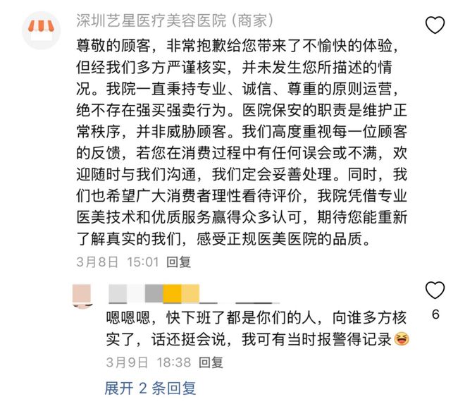 甚至有大众点评消费者反馈,该机构存在强买强卖的现象,该消费者表示,自己被几个人逼着付款,因为对方表示已经为其预留了医生的时间,马上就能做项目了,但其实该消费者已经等待了半个小时,于是该消费者决定退款,却被该机构的保安包围,直至该消费者报警后,该机构才答应为其退款并让其顺利离开。该评价一经发出深圳艺星医疗美容就进行了解释,表示绝无强买强卖行为,但是该消费者也十分强硬,表示自己手里有报警记录作为证据。