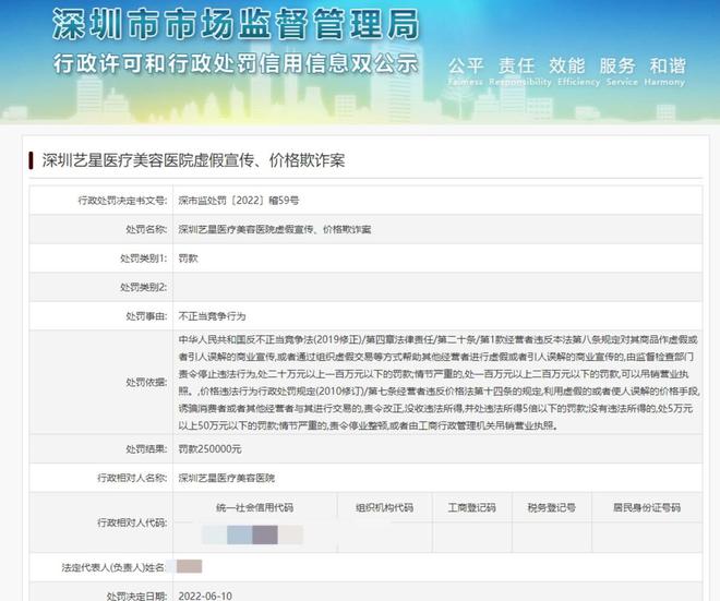 2022年6月10日,深市监处罚〔2022〕稽59号行政处罚决定书显示,深圳艺星医疗美容医院因虚假宣传、价格欺诈,被深圳市市场监督管理局罚款25万元。