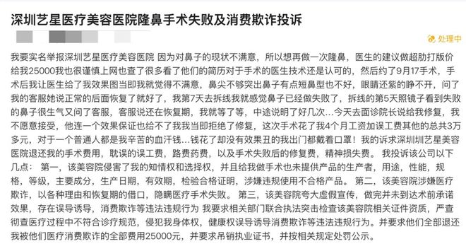 此外,该消费者还认为深圳艺星医疗美容涉嫌医疗欺诈,以各种理由和恢复期的借口,隐瞒医疗手术失败。该消费者还指出,深圳艺星医疗美容夸大虚假宣传,做完并未达到之前承诺效果,存在误导诱导,消费欺诈等违法违规行为。