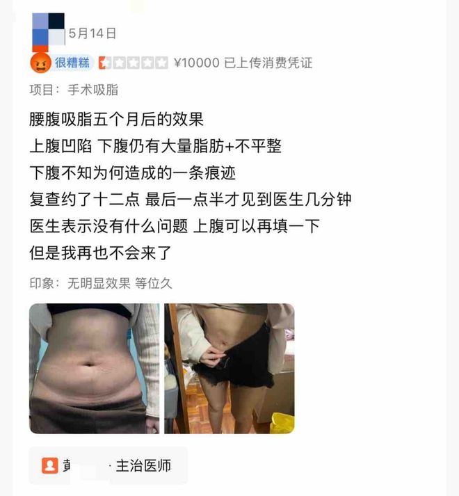 巧合的是,5月14日,也有消费者在大众点评上,对深圳艺星医疗美容机构的评价中,展示了自己吸脂五个月的术后效果。并指出该机构医生的不准时和敷衍态度,该消费者表示再也不会前往该机构复诊就医。值得关注的是,大众点评这位消费者所反馈的医生,正是消费保用户反馈的黄某某。