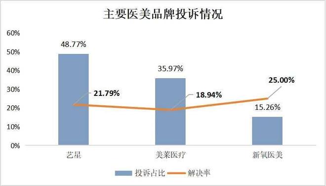 据消费保投诉平台数据显示,在众多医美机构中,艺星的投诉量最高,占比48.77%,而其投诉解决率仅为21.79%;其次,美莱医疗和新氧医美的投诉量分别位列第二、第三,解决率分别为18.94%、25.00%。
