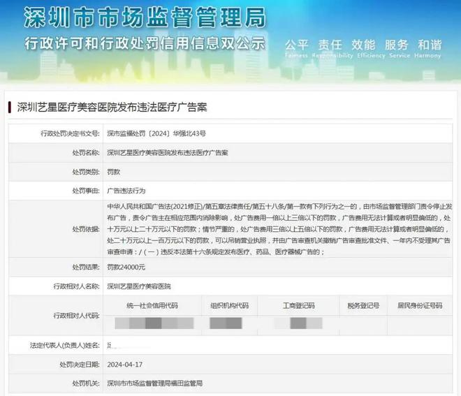 去年4月17日,深圳艺星医疗美容医院因发布违法医疗广告案,被深圳市市场监督管理局福田监管局,处以罚款24000元的行政处罚。