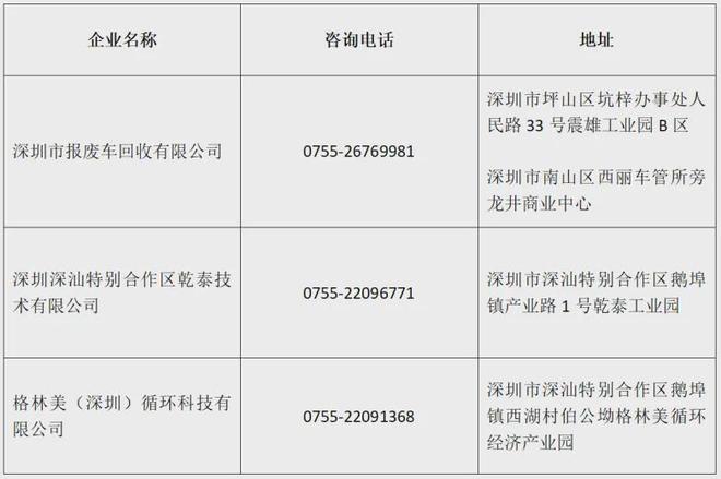 旧车应交售给深圳市内符合条件的回收拆解企业进行报废,由该回收拆解企业出具报废回收证明。符合条件且参加活动的回收拆解企业名单如下: