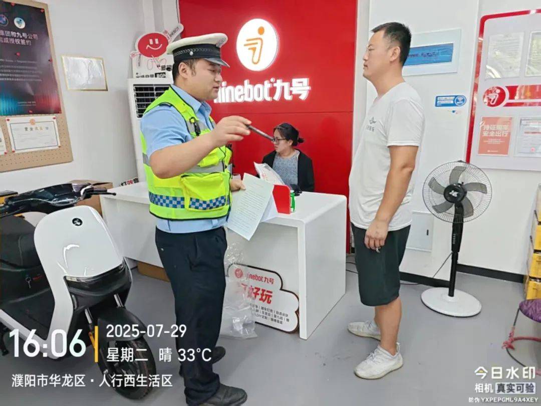 为切实加强辖区道路交通安全管理,从源头防范电动摩托车交通事故,7月29日下午,濮阳市公安局交通勤务华龙区交警大队和开发区交警大队分别组织民辅警深入辖区多个电动车销售及维修门店,开展交通安全知识宣传活动,并向经营者逐一送达《电动车销售和维修经营者告知书》,拧紧交通安全“源头阀”。